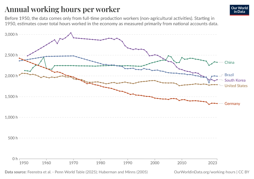 The declines in the length of the work day and the number of working days have been driven by several factors, including increases in productivity and the adoption of regulations that limit working hours. We discuss these and other key drivers behind working hours trends across countries and time in a series of forthcoming posts.6