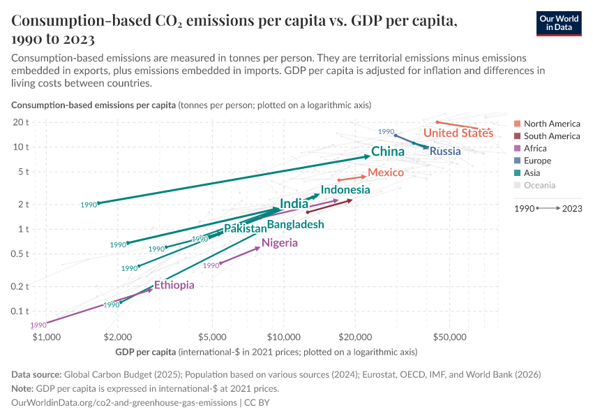 By default, the chart shows the change of income and emissions for the countries that are home to more than 100 million people, but you can add other countries to the chart.