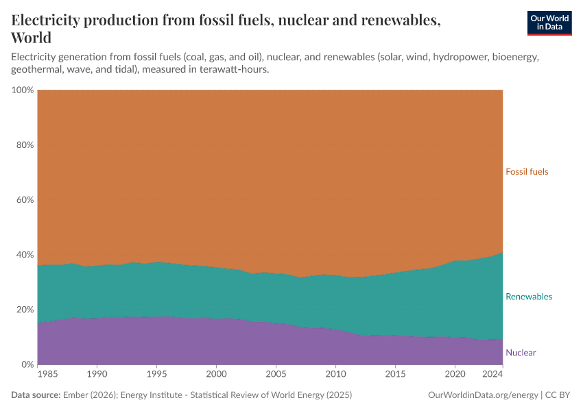One sector where we have developed several alternatives to fossil fuels is electricity. Nuclear power and renewables emit far less carbon (and are much safer) than fossil fuels. Still, as the last chart shows, their share in global electricity production hasn't changed much: only increasing from 37% to 41% over the last three decades.